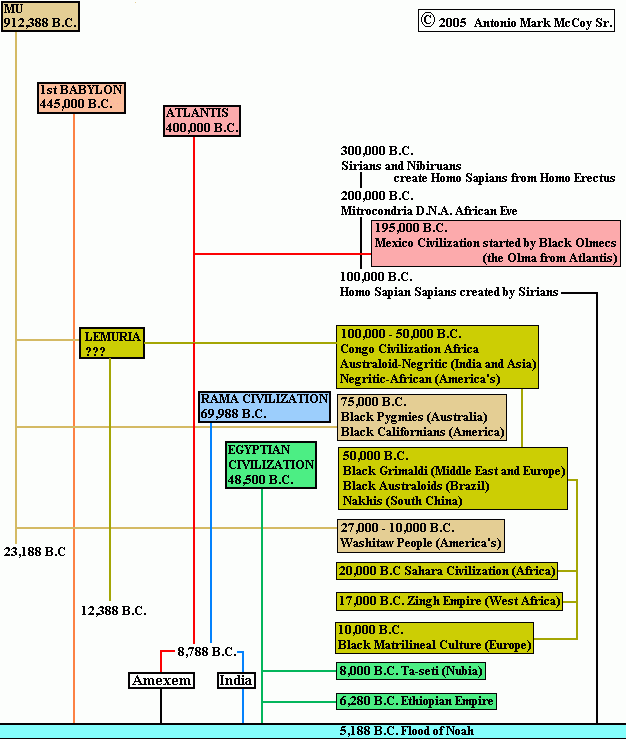 Then in 12,400 B.C. it completely sinks all of Lemuria. Adam is placed on Earth after that. Then Enki reclaims the Nile valley. The Sinai peninsula is retained by the Anunnaki for a post-Diluvial spaceport also. A control center is established on Mount Moriah (the future Jerusalem). Then in 9780 B.C Ra or Marduk, Enki's firstborn son, divides dominion over Egypt between Osiris and Seth. In 9330 B.C. Seth kills Osiris. In 8970 B.C. Horus avenges his father Osiris by launching the First Pyramid War. Defeating Seth. Seth then escapes to Asia, and seizes the Sinai Peninsula and Canaan. The Ancient Egyptian's also fight a successful war against Atlantis. Defeating them in a great battle. In 8788 B.C. Atlantis is sank by Planet Nibiru.